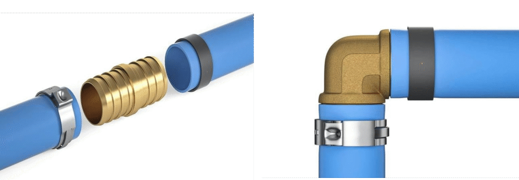 Conexión de clamp PEX: Se componen de un anillo de acero inoxidable que fija la tubería PEX y el accesorio. Comparten los mismos tipos de accesorios que las conexiones de crimpado PEX. Ideal para espacios reducidos o estrechos.