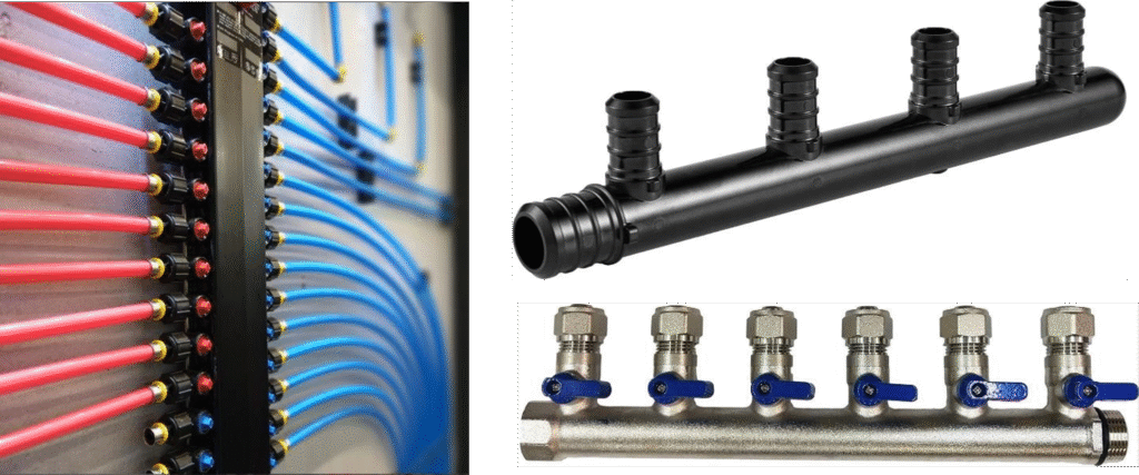 Los manifolds y multi puertos son la solución ideal para una distribución ordenada y eficiente del sistema PEX, permitiendo llevar agua de forma directa desde un centro de distribución hacia cada punto de consumo. Este modelo facilita el control independiente de cada línea, lo que simplifica mantenimientos y evita interrupciones innecesarias en toda la red. Gracias a su diseño práctico, se reduce el riesgo de fugas, se optimiza la presión en cada salida y se logra una instalación más limpia y organizada. Con su uso, obtienes mayor seguridad, comodidad y durabilidad en tus proyectos, además de la flexibilidad de adaptar la instalación según el tipo de obra.